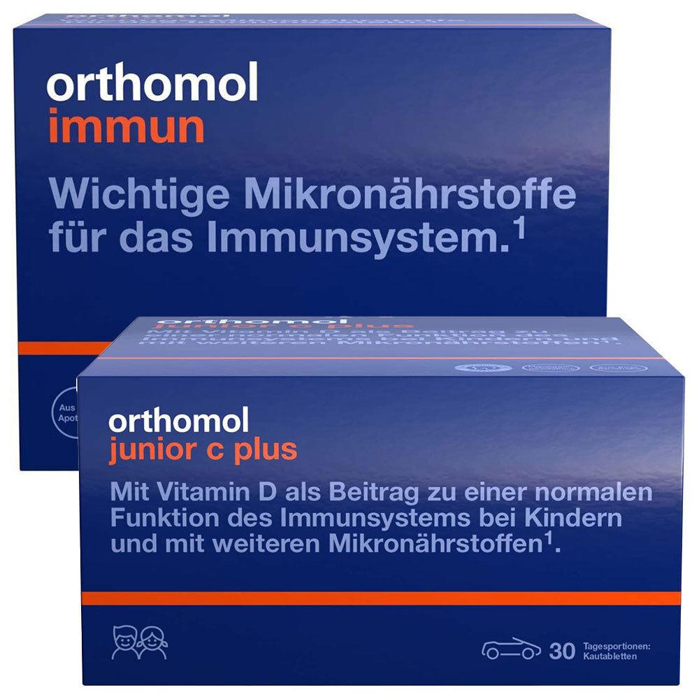 Набор Orthomol Immun + Orthomol junior C plus - комплекс витаминов и минералов для поддержки иммунной системы взрослых и детей. Включает гранулы для взрослых с витаминами C, D, цинком и жевательные таблетки для детей с витамином C. Способствует нормальной функции иммунитета, содержит 30 дневных порций каждого продукта