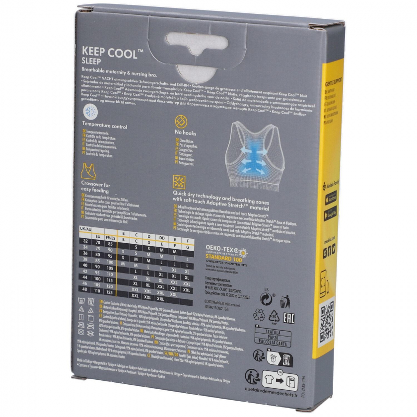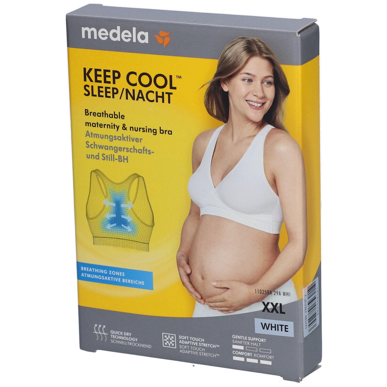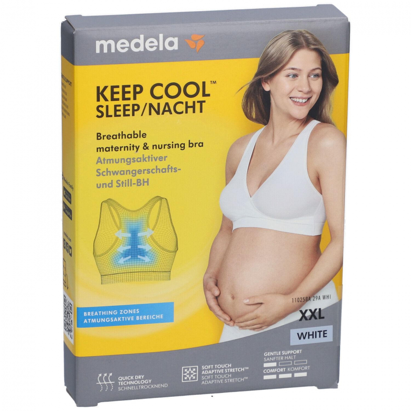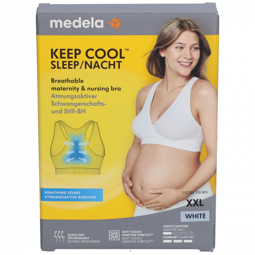 Бюстгальтер для сна Medela Keep Cool™ для беременных и кормящих женщин белого цвета размера XXL. Имеет технологию быстрой сушки, дышащую зону на спине, растягивающуюся конструкцию без косточек и крючков для комфортного сна. Подходит для ношения от беременности до периода грудного вскармливания.