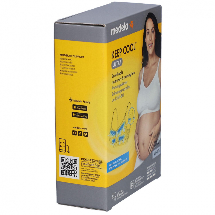 Бюстгальтер Medela Keep Cool™ Ultra Komfort для беременных и кормящих женщин белого цвета размера XXL. Имеет 6 вентиляционных зон, технологию QuickDry для регулирования температуры тела, адаптивную растягивающуюся ткань, которая растет вместе с телом, съемные вставки и полностью отстегивающиеся чашки для удобного кормления.