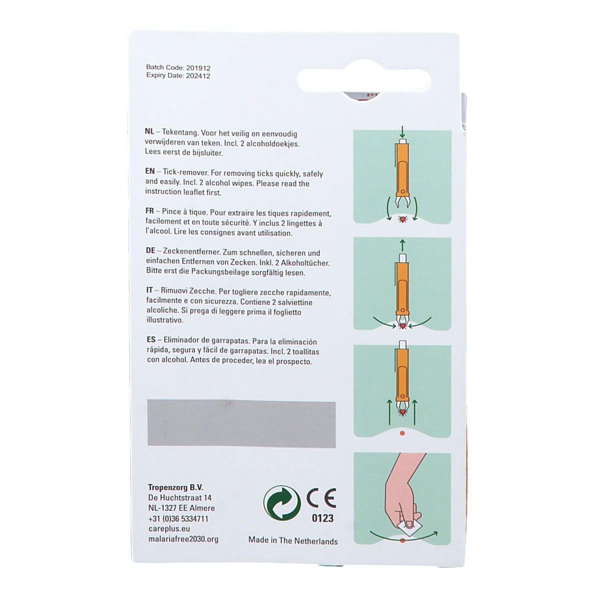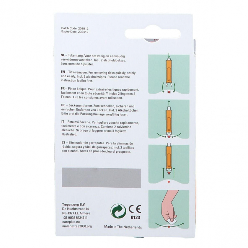 Специальный пинцет care PLUS® для бережного, быстрого и безопасного удаления клещей. В комплекте идут 2 спиртовые салфетки для дезинфекции. Произведено в Нидерландах компанией Tropenzorg B.V.