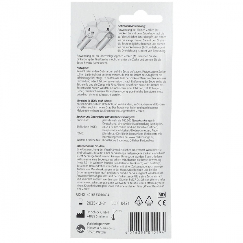 Ультра-пинцет для удаления клещей Dr. Schick's Zeckenzange Ultra - профессиональный медицинский инструмент для безопасного и эффективного удаления клещей у людей и животных. Простая и легкая в использовании конструкция с запатентованной технологией предотвращает отрыв головки клеща и снижает риск инфекции.