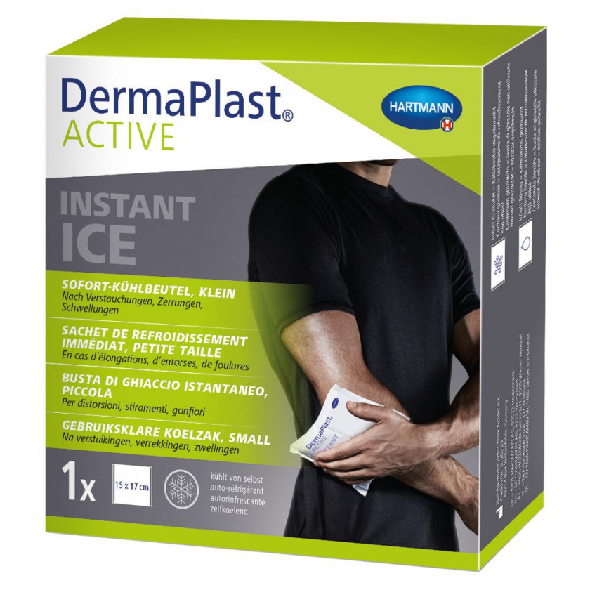 Dermaplast® Active Instant Ice - самоохлаждающийся мгновенный холодный компресс для лечения спортивных травм, растяжений, ушибов, ожогов и зубной боли. Обеспечивает быстрое охлаждение поврежденного участка, уменьшает воспаление и облегчает боль. Размер 15x17 см.