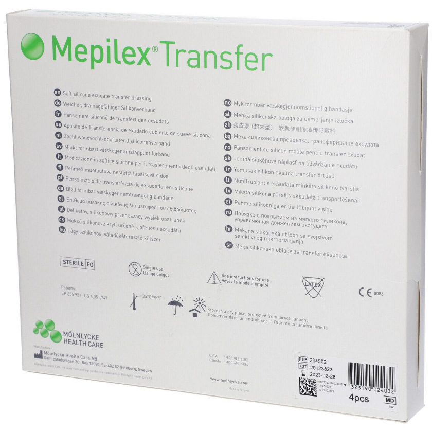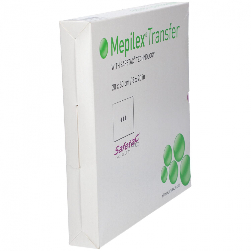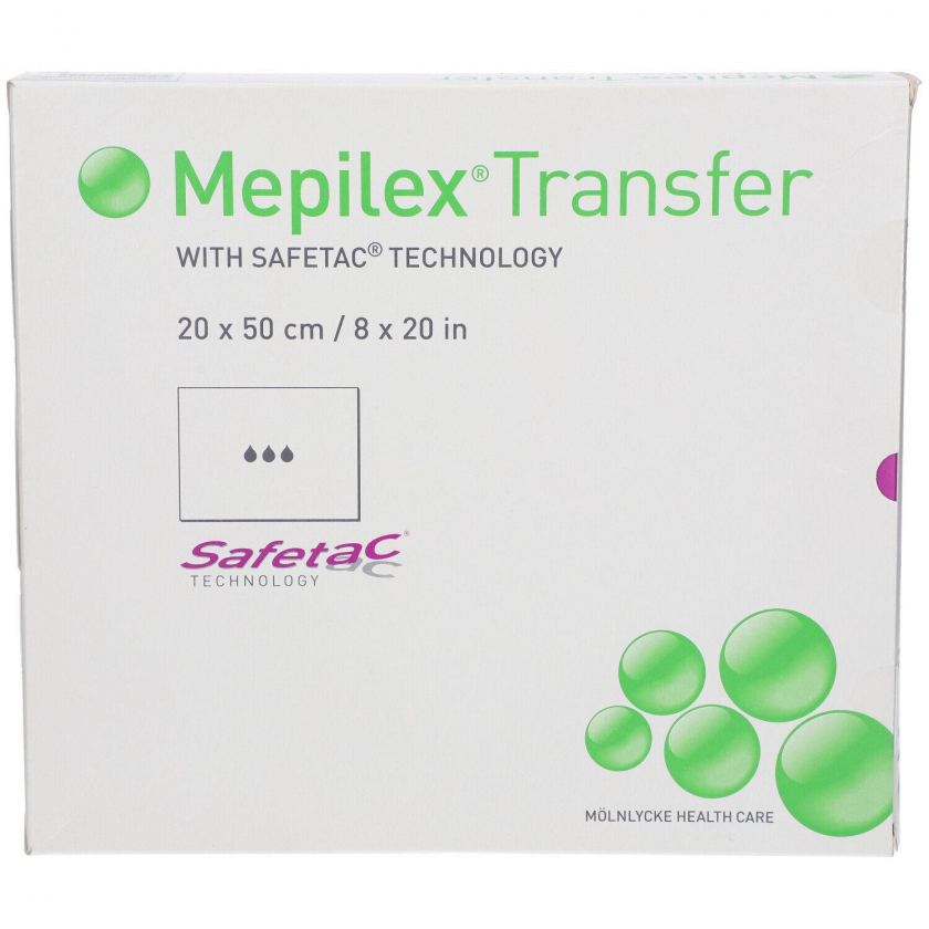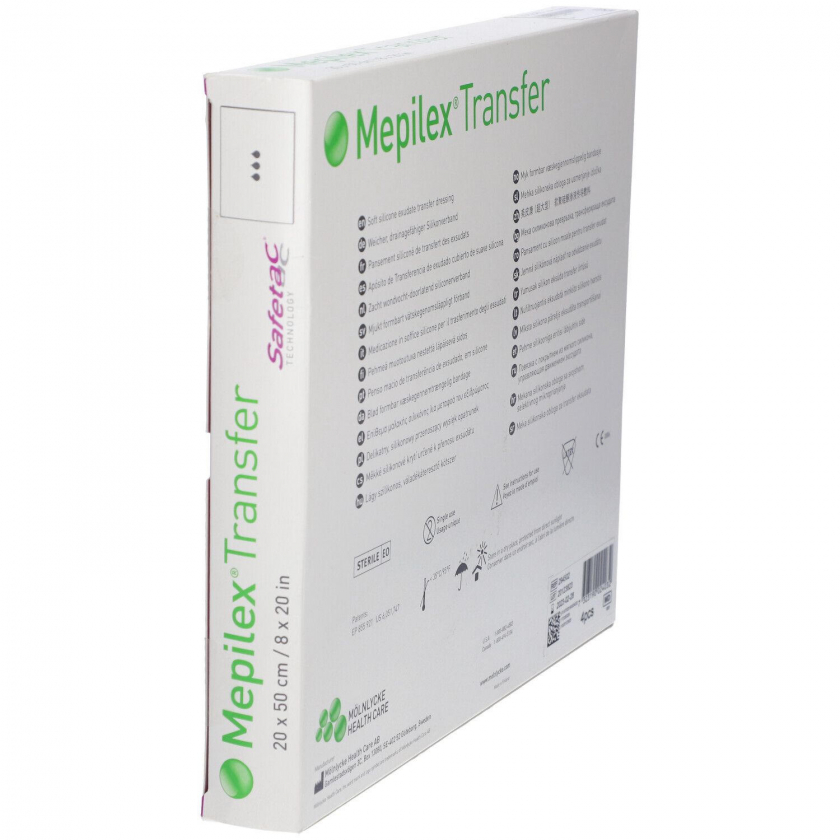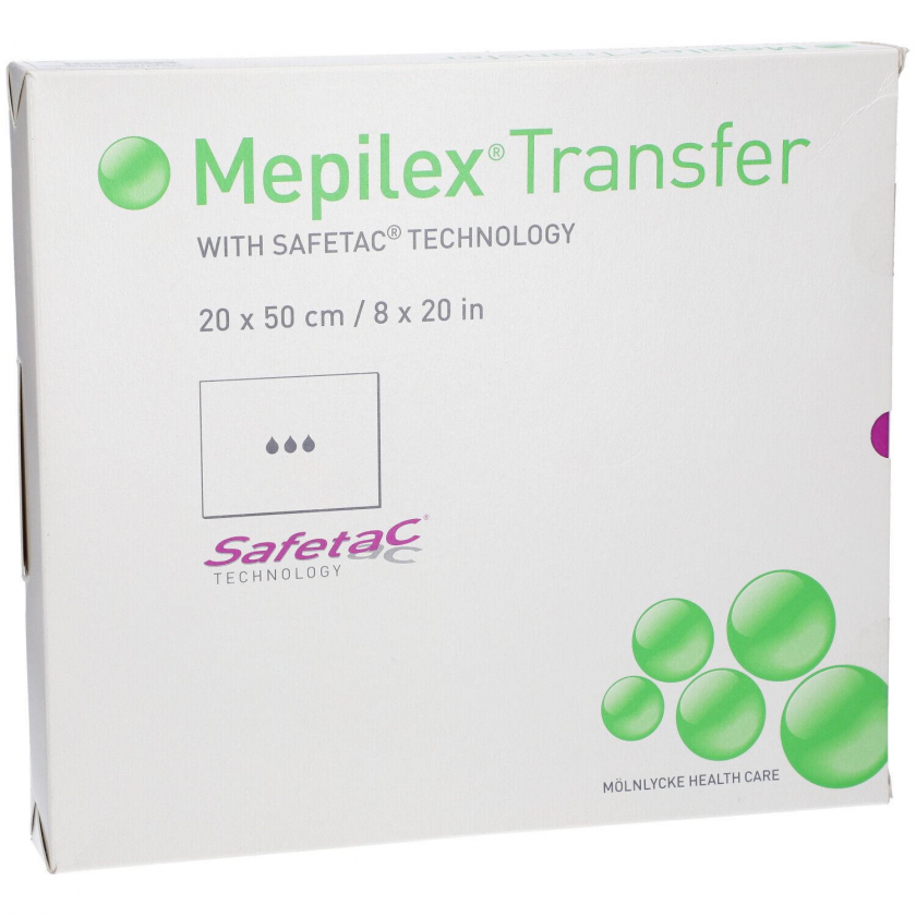 Стерильная повязка Mepilex Transfer размером 20x50 см для ухода за ранами. Мягкий дренирующий силиконовый перевязочный материал с полиуретановой пеной обеспечивает комфорт и защиту при заживлении ран.