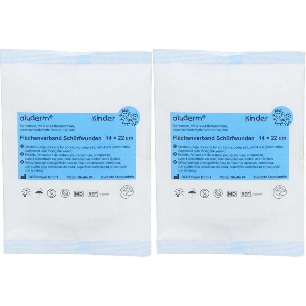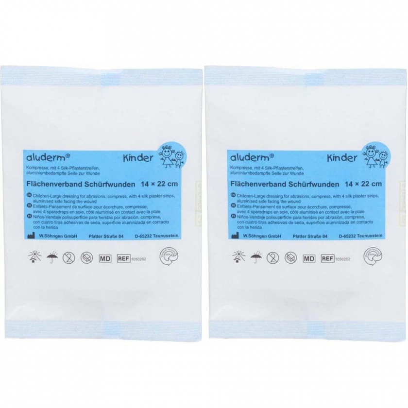 Детский перевязочный материал aluderm® для больших ссадин с алюминизированной раневой подушечкой. Стерильная упаковка включает перевязочное полотно 14x22 см и 4 готовых к использованию шелковых пластырных полоски. Не прилипает к ране, гипоаллергенный, дышащий, без химических связующих веществ.