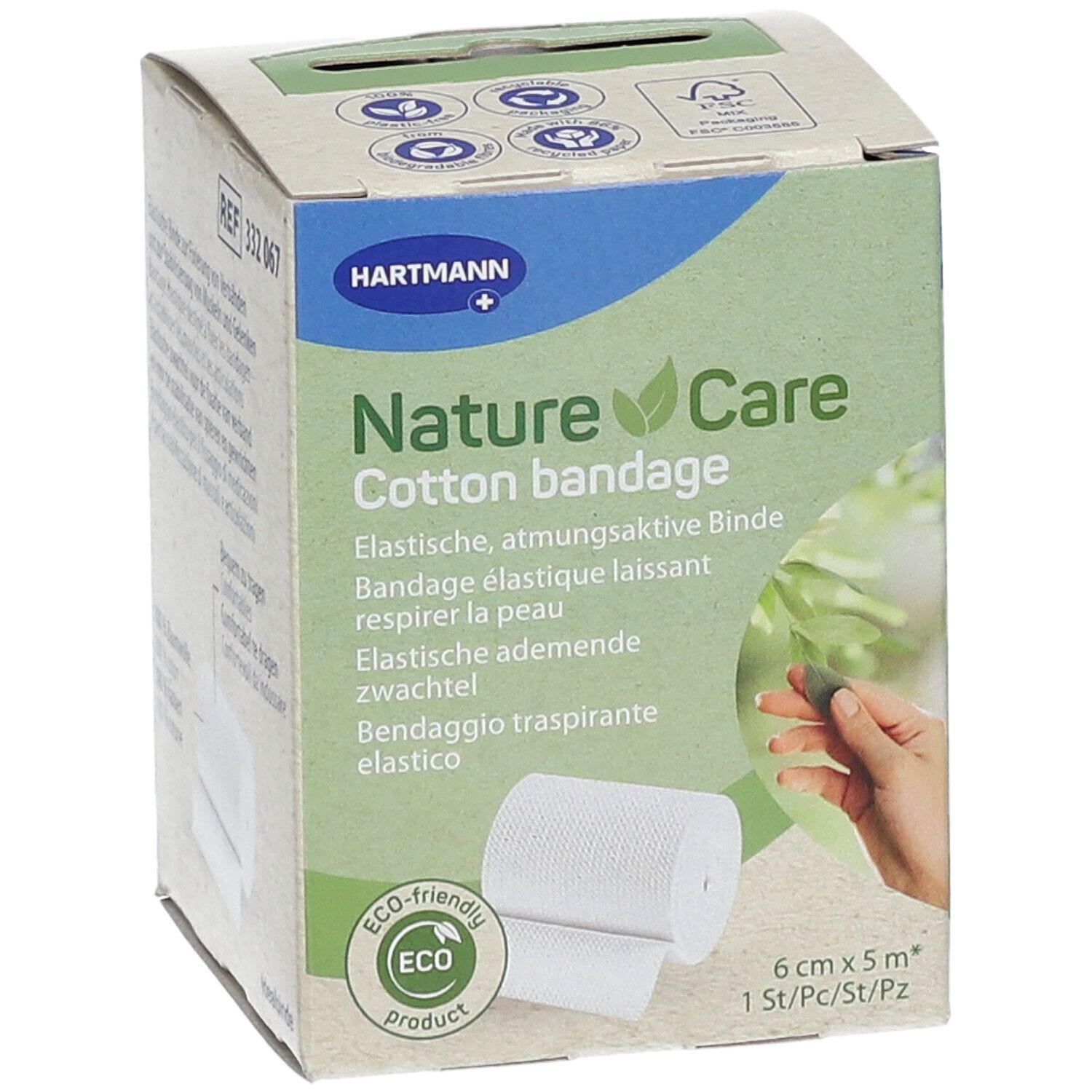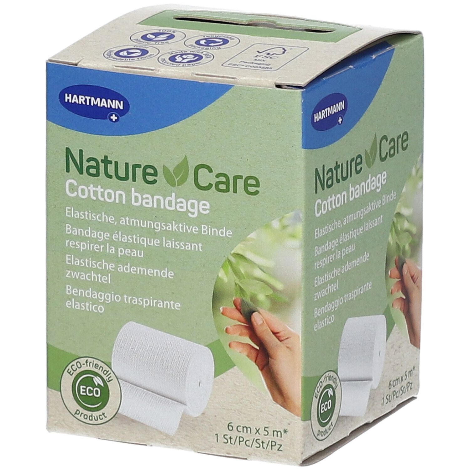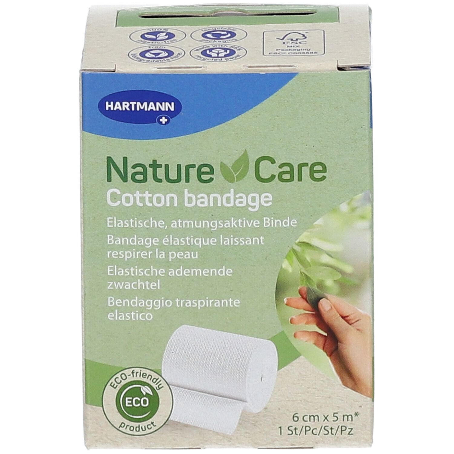 Эластичная хлопковая бинтовая повязка Nature Care для медицинского применения. Размер 6 см х 5 м. Используется для фиксации перевязочных материалов и стабилизации мышц и суставов. Производится в Германии компанией PAUL HARTMANN AG.