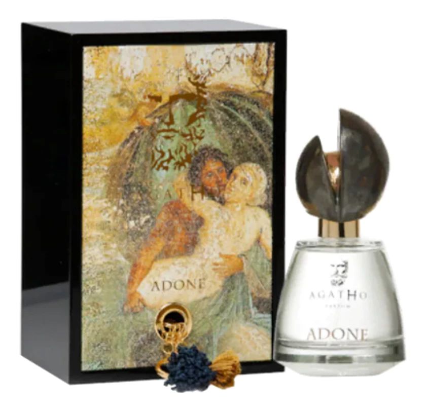 Ароматическая композиция Adone посвящена древней легенде об Адонисе и Афродите, тема которой часто использовалась на фресках Помпеи. Парфюм, чьи цветочные и обволакивающие древесные ноты уходят корнями в мифы, которые гипнотизируют чувства, как молодой и красивый Адонис очаровал Афродиту. Высвобождая свежесть цветов глицинии, жасмина, герани, дамасской розы и белой лилии, этот аромат интерпретирует и выражает прекрасный и проклятый образ Адониса, как хрупкий прекрасный цветок, жизнь которого коротка. Древесные ноты, амброксан, мускус и амбретта, звучащие в финальном аккорде Agatho Parfum Adone, сплетаются в долгое ольфакторное эхо, напоминающее о прекрасной, но грустной легенде.