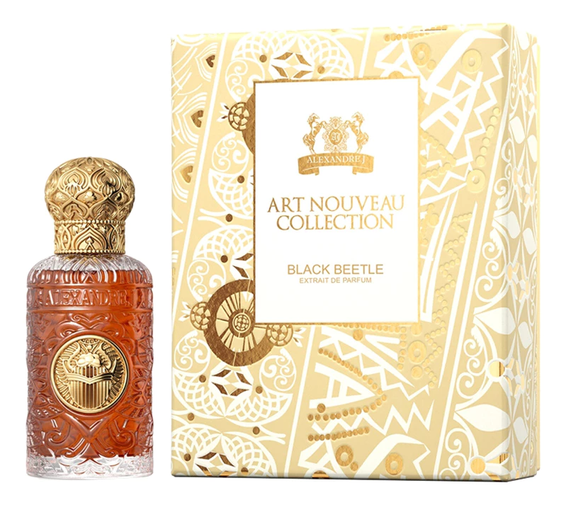 Роскошный флакон с фактурным орнаментом подчеркивает эксклюзивность заключенного в нем парфюма Alexandre J. Art Nouveau Collection - Black Beetle 2023 и станет украшением любого туалетного столика.