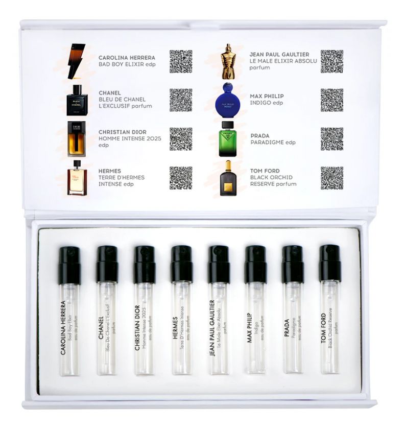 Приобретая набор пробников, вы получаете возможность примерить на себя восемь актуальных в текущем сезоне ароматов. Это отличная возможность подобрать себе парфюм, который захочется купить ещё раз. А поскольку объём пробников (1,5 мл) достаточен для нескольких применений (до 35-ти распылений), их можно использовать для ежедневного ношения и создания различных модных образов.