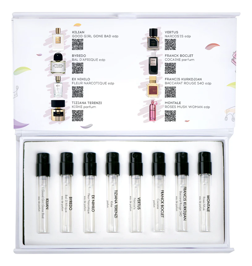 Набор содержит восемь ароматических композиций от разных брендов (каждый мини-флакон объёмом 1,5 мл обеспечивает до 35 распылений). Каждая из них обладает своим характером, индивидуальностью и уникальным стилем. С их помощью вы можете моделировать образ, подчёркивая свой вкус и непохожесть на других. Примерив уникальные селективные духи, вы можете даже найти свой идеальный аромат.