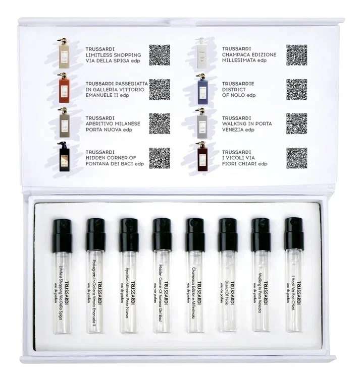 Чтобы вы могли примерить на себя лучшие образцы парфюмерии Trussardi, наши эксперты составили для вас набор из восьми пробников. В него входят восемь унисекс-парфюма, которые могут носить представители обоих полов. Все ароматические композиции отличаются стилем и гармоничностью, стойкостью и шлейфовостью звучания.