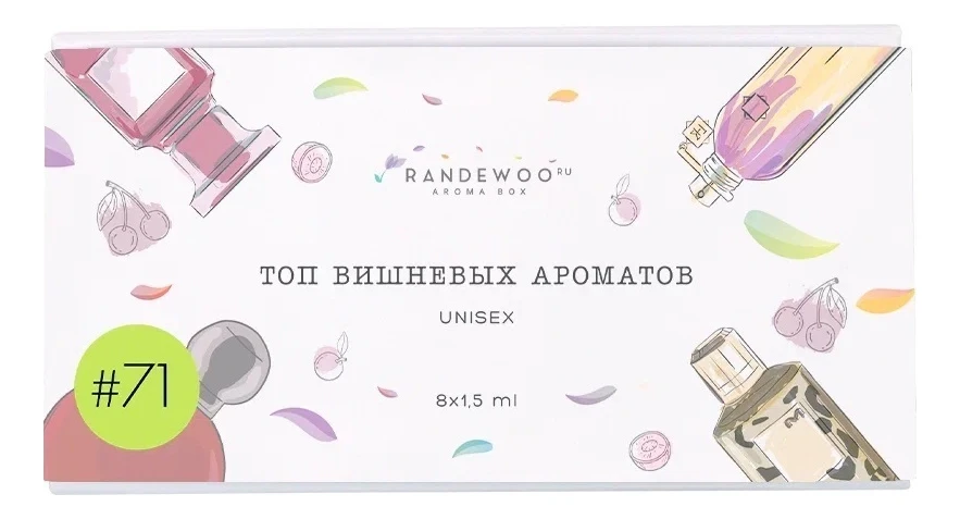 Если вам нравятся такие ароматические композиции, то придётся по душе и подборка из восьми пробников лучших вишневых ароматов, сделанная специалистами Randewoo. Основываясь на опыте и анализе предпочтений более ста тысяч покупателей, они отобрали лучшие тематические композиции этой группы. Теперь вы можете, оставаясь в любимой ароматической группе, поэкспериментировать с образами, а также подобрать аромат, знакомство с которым захочется продлить и после того, как закончится его пробник.