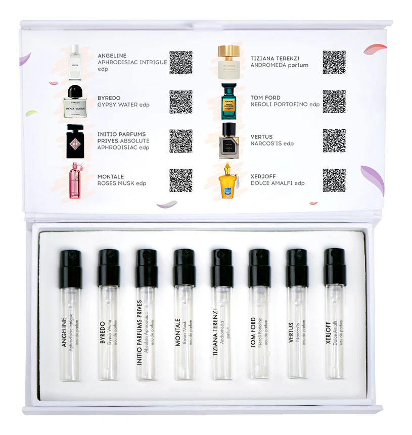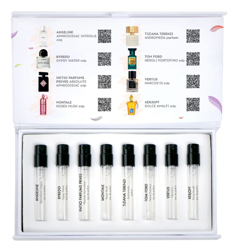 Чтобы вы могли примерить на себя лучшие ароматы афродизиаки, наши эксперты, на основании многолетнего опыта работы и анализа предпочтений более ста тысяч покупателей, составили для вас набор из восьми пробников (каждый мини-флакон объёмом 1,5 мл обеспечивает до 35 распылений).