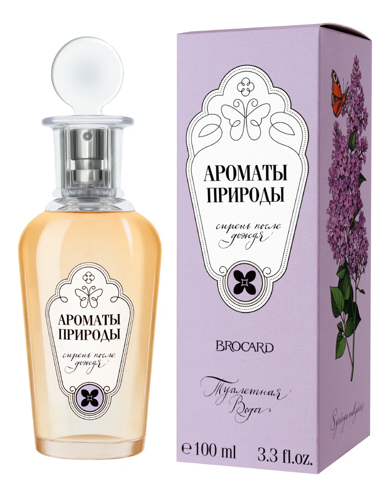 Композиция заключена во флакон, дизайн которого напоминает аптечные склянки начала прошлого века. Знакомство с ароматом начинается с нот бергамота, майского ландыша и цветущего миндаля. Сердце образовано великолепными аккордами, сирени, розы и жасмина. Особую притягательную сладость запаху Brocard Ароматы природы Сирень после дождя придают оттенки меда, ванили и цветов гелиотропа.