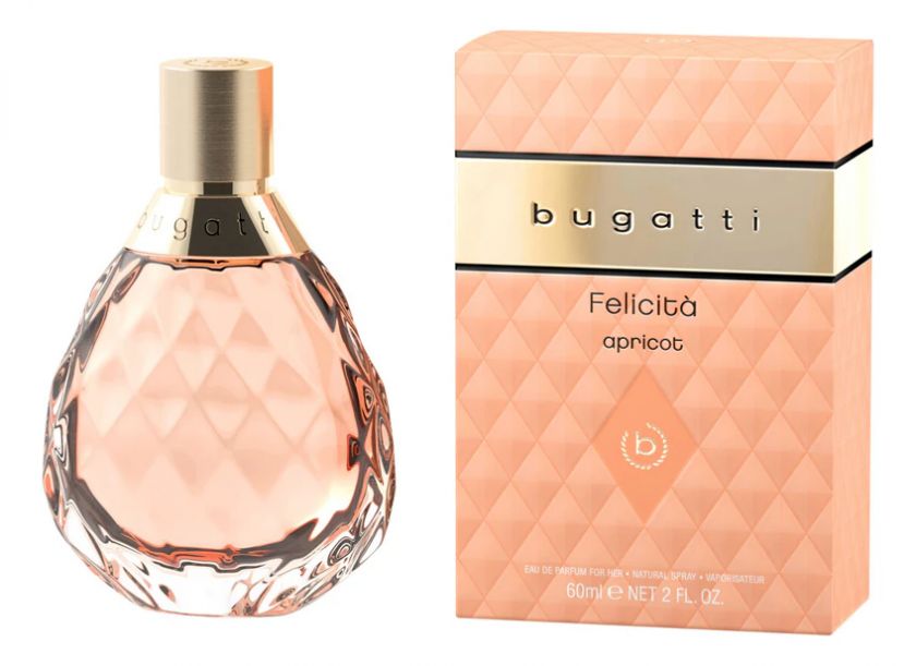 Bugatti Felicità Apricot — цветочно-фруктовый аромат, выпущенный в 2024 году немецким модным домом Bugatti. Сочетание каплевидного силуэта, рельефа изящной надписи и матового колпачка делают флакон Felicità настоящим произведением искусства, которое взывает к чувствам и вызывает предвкушение уникального аромата.