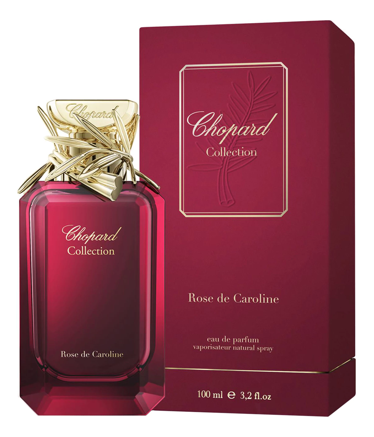 Аромат Chopard Rose De Caroline заключен в брендовый флакон в виде ограненного драгоценного камня, выполненного в глубоком гранатовом цвете и украшенный золотым колпачком,обвитым знаменитой «пальмовой» ветвью.