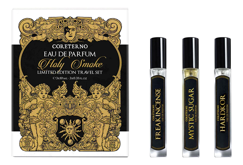 Coreterno Holy Smoke — дорожный набор из трех ароматов бренда Coreterno. Набор идеально подходит для тех, кто ищет духовного просветления, чувственности и приключений. Насладитесь волшебством ароматов Coreterno и позвольте своим чувствам подняться на новый уровень мистического очарования.