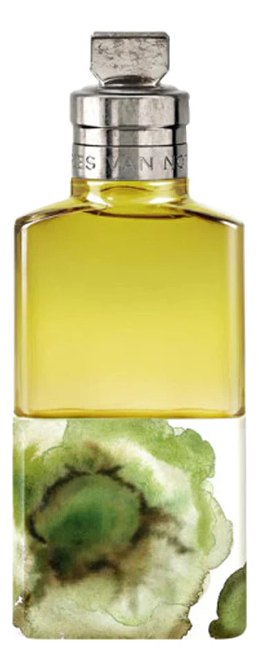 Аромат Dries Van Noten Vanilla Camouзаключен в глянцевый флакон оливково-зеленого цвета, украшенный в нижней части абстрактным зеленым цветком на белом фоне.