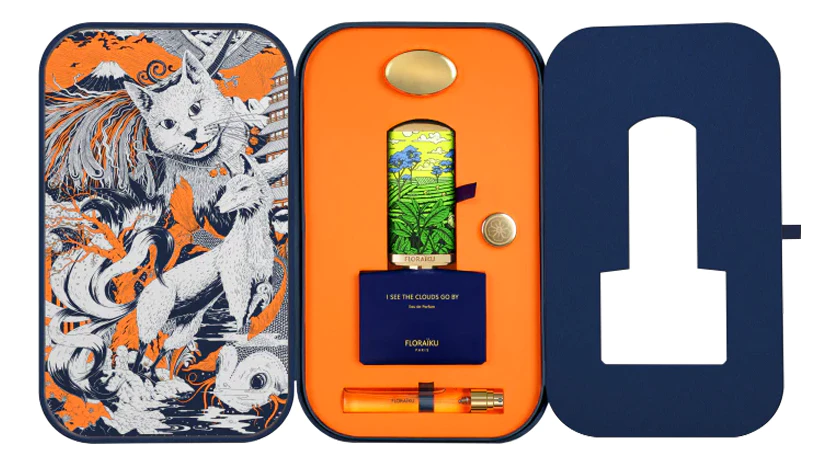 Парфюм I See The Clouds Go By заключен в кобальтовый флакон с высоким колпачком, обтянутым золотистой итальянской гранулированной кожей с изображением бонсая. Чехол колпачка сшит вручную и может использоваться в качестве футляра для миниатюры-рефила объемом 10 мл.