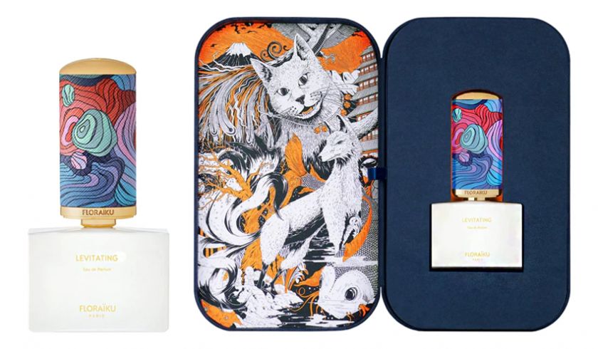 Парфюм Floraiku Levitating заключен в белый флакон с высоким колпачком, обтянутым итальянской гранулированной кожей с изображением разноцветных волн. Чехол колпачка сшит вручную и может использоваться в качестве футляра для миниатюры-рефила объемом 10 мл.