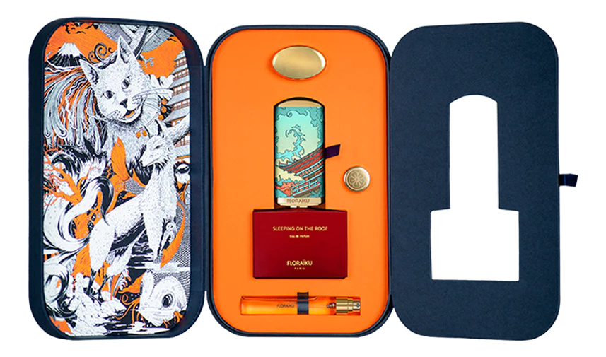 Парфюм Sleeping On The Roof заключен во флакон кобальтового цвета с высоким колпачком, обтянутым итальянской гранулированной кожей с изображением японской природы. Чехол колпачка сшит вручную и может использоваться в качестве футляра для миниатюры-рефила объемом 10 мл.