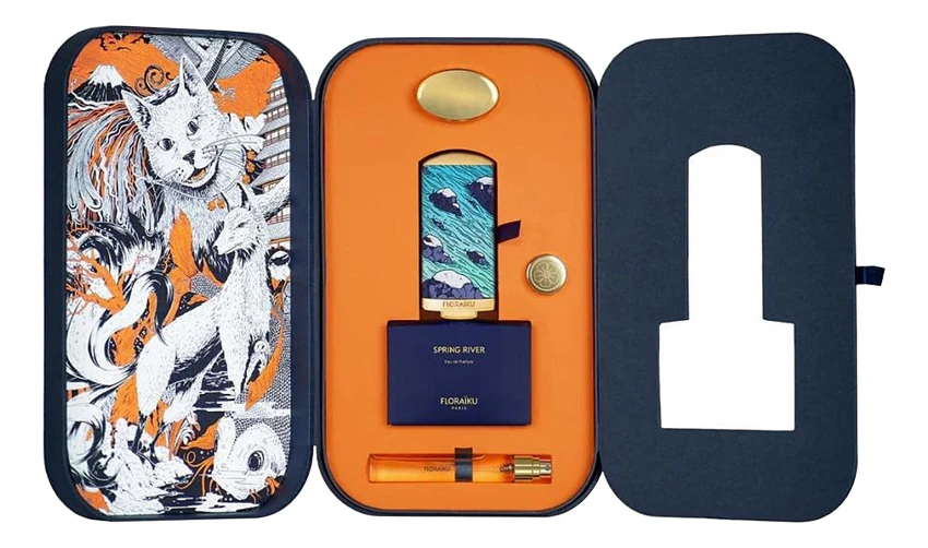Аромат Floraiku Spring River предлагается в характерном для бренда синем флаконе с обтянутой кожей колпачком, украшенным красивым принтом текущей по камням воды.