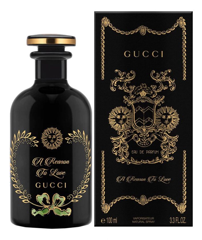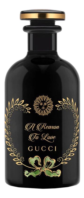 Аромат Gucci A Reason To Love заключен в черный лакированный флакон, украшенный узором из сусального золота и декорированный изображением банта из зеленой эмали. Как и другие ароматы коллекции The Alchemist's Garden, парфюм поставляется в специальном муаровом мешочке.