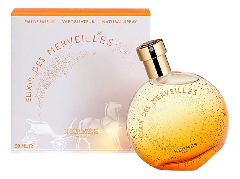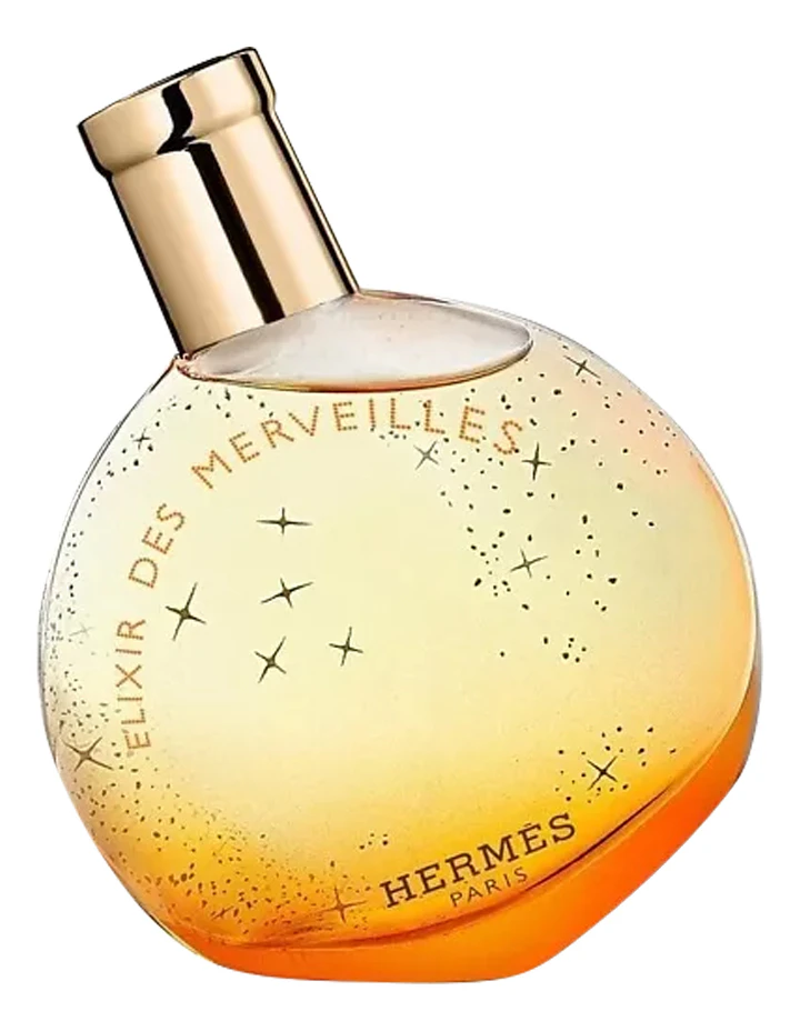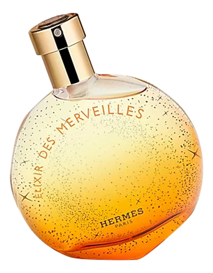 Апельсин доминирует в цитрусовом аромате Hermes Eau Des Merveilles Elixir. Ваниль и шоколад оттеняют цитрусовый аккорд. Нотки теплового сандалового дерева, амбры и пачули постепенно заменяют карамельную сладость. Обладательница парфюма почувствует превосходство и уверенное чувство благоговения. Аромат Hermes Eau Des Merveilles Elixir (Гермес. Чудесная вода. Эликсир) был выпущен в 2006 году. Это более яркий, насыщенный вариант парфюма Hermes Eau Des Merveilles. И флакон стал более оранжевым и блестящим, ярким. Звездная пыль сместилась ближе к горлышку флакона. Прохладный благородный кедр, смолы Перу и Сиама, аромат дубовой коры создают неповторимый шлейф, который сменяет теплые аккорды сердечных нот. Парфюмерная композиция включает такие нотки как: бальзам перу, сандаловое дерево, ванильный сахар, пачули, бобы тонка, амбра, ладан, дуб, карамель, смолы из Сиама, апельсин, кедр.
