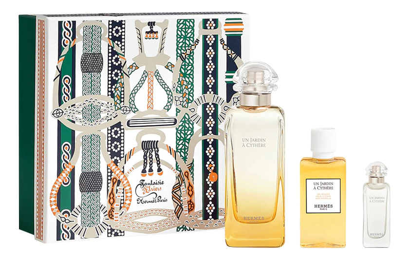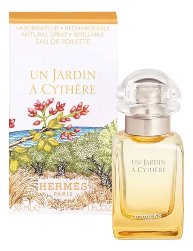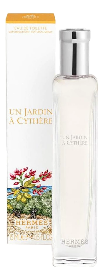 Hermes Un Jardin A Cythere — солнечный фужерно-цитрусовый унисекс-парфюм,выпущенный в 2023 году французским брендом Hermеs. Парфюм является частью знаменитой серии Parfums Jardins. Он вдохновлен прекрасным греческим островом Китира и обещает моменты свежести, мечтательности и побега в место, где пахнет травами, оливковым деревом и свежими фисташками.