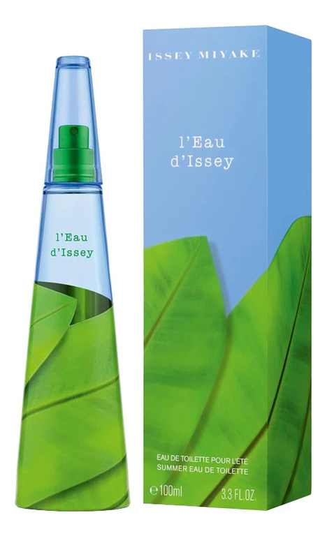 Аромат Issey Miyake L'Eau d'Issey Pour Femme Eau de Toilette L'Ete заключен в удлиненный флакон в форме конуса. О легкости и лете говорят зеленые листья и голубое небо упаковки. У обладательницы этого аромата каждый день будет беззаботным и прозрачным, без проблем и огорчений.