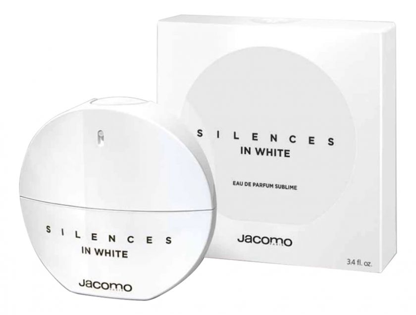 Ароматическая композиция стартует пронзительным ароматом белой фрезии, подчеркнутым запахом медового песика и пряно-перечного имбиря. Затем на передний план выходит душистый букет цветочных нот апельсинового цвета, жасмина, туберозы и ландыша. Тогда как финальный аккорд Jacomo Silences In White дарит теплые древесные ноты, сладость коричневого сахара, мускус, пряно-лесной запах дубового мха и притягательное тепло солнечных нот.