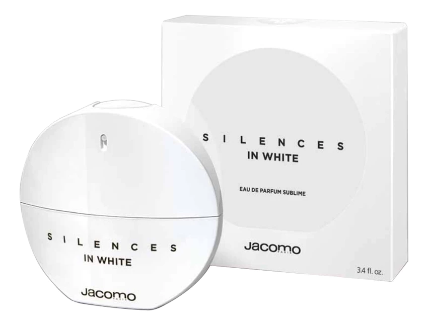 Jacomo Silences In White — очаровательный женский многослойный цветочный аромат с мускусными, пудровыми и сладкими гурманскими гранями, выпущенный в 2023 году брендом Jacomo. Оригинальный белоснежный флакон в форме диска подчеркивает элегантность и чистоту звучания заключенного в нем парфюме.