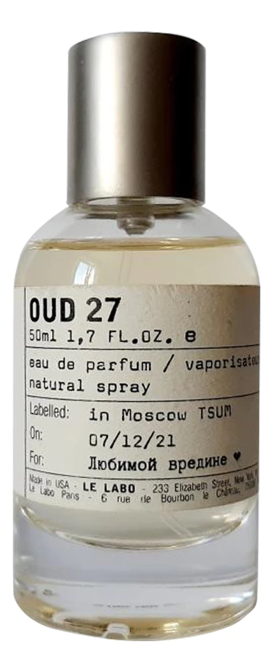 Oud 27 («Уд 27») – аромат для мужчин и женщин от молодого американского парфюмерного бренда Le Labo. Парфюмерная композиция Oud 27 от Le Labo была создана 2009 году и вошла в группу ароматов восточные древесные. Этот богатый, глубокий, теплый и экзотический аромат идеально подойдет как для деловых встреч, так и для романтического вечера.