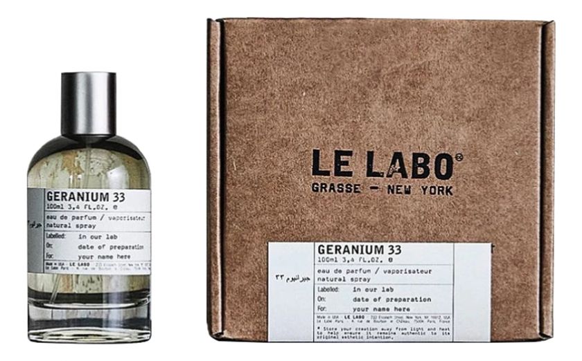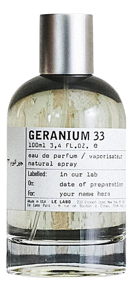 Ароматическая композиция Geranium 33 начинает звучание с искристой цитрусовой свежести бергамота с вкрапленными искорками пряного черного перца. Главный мотив композиции — герань. Ее аромат имеет богатый спектр запахов, главные из которых зелёно-травянистые, землистые и мятные, пряные и розовые. Герань также отличается терпким, доминирующим звучанием, которое смягчается в композиции шелковисто-пряным ароматом розы. А завершает звучание парфюма Le Labo Geranium 33 хвойно-дымный кедр, древесно-сливочный сандал и волна нежнейшего шелковистого мускуса.