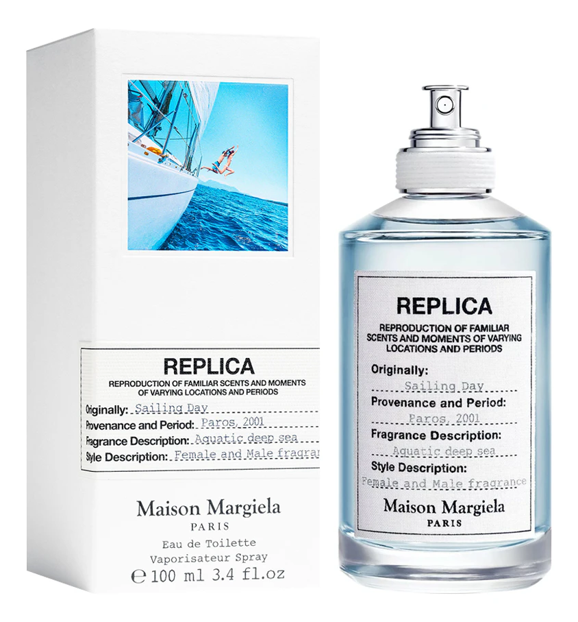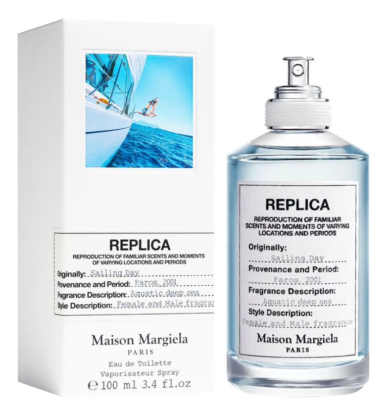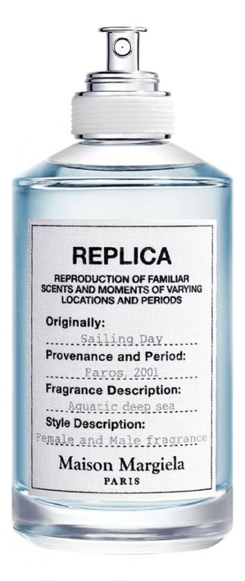 Sailing Day - новая элитная туалетная вода с древесным пряным ароматом для женщин и мужчин из парфюмерной серии Replica французского модного дома Maison Martin Margiela, представленная в сентябре 2017 года. Аромат Sailing Day словно прыжок двух влюбленных в морскую пучину страстей и желаний, который заставляет покорять могучие водные пространства, пронзенные солнечными лучами, с терпким соленым привкусом на губах.