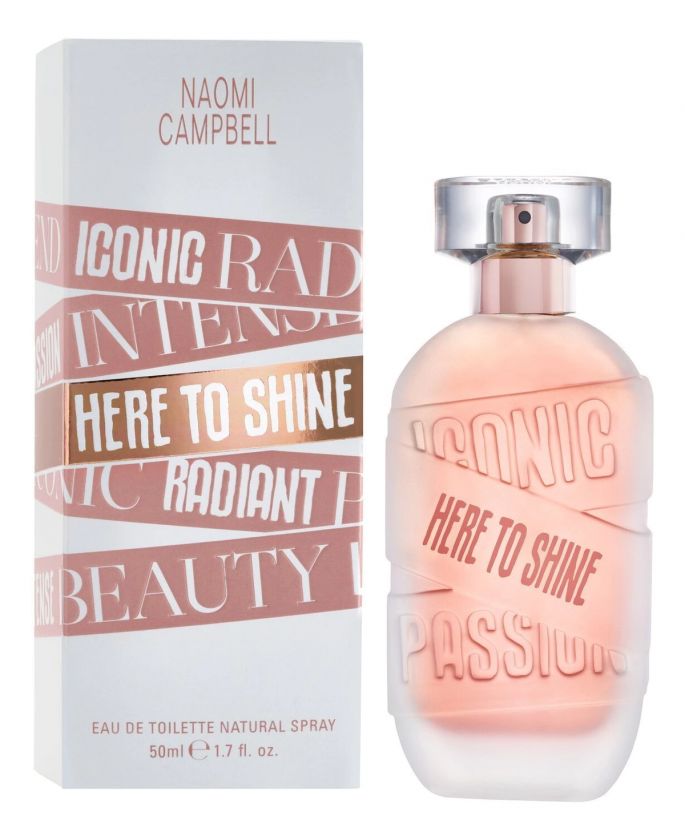 Naomi Campbell Here To Shine — блистательный женский цветочно-древесный аромат с изысканным мускусным шлейфом, выпущенный в 2021 году под маркой бренда Naomi Campbell. Аромат продолжает концепцию выходившего годом ранее парфюма Here To Stay и раскрывает секрет сияющего образа супермодели Наоми Кэмпбелл, историю ее блистательного успеха в шоу-бизнесе.