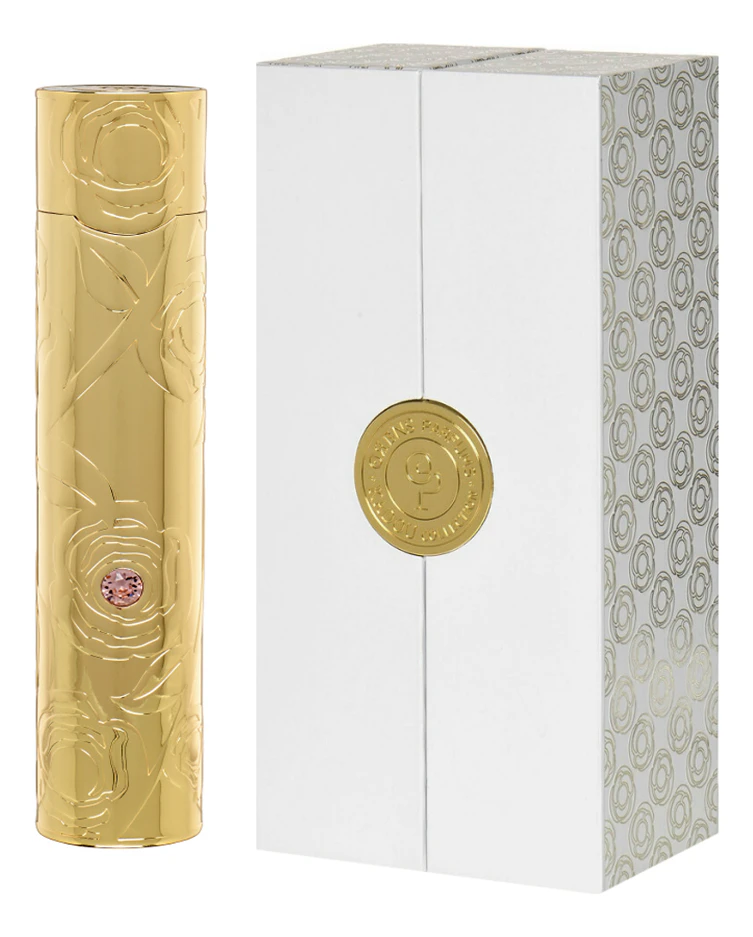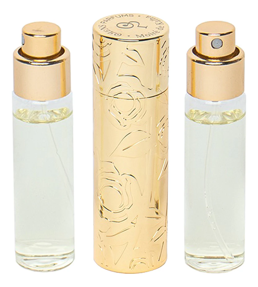 Золотистый флакон Moire De Kalha украшен резным изображением розы — королевы цветов, которая является символом коллекции. Футляр с изысканной гравировкой изготовлен из полированного металла и декорирован сиреневым кристаллом Swarovski. В футляре находится флакон парфюмерной воды 50 мл. Набор также содержит бархатный мешочек, в котором очень удобно носить флакон с любимым парфюмом в сумочке.