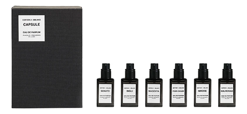 Комплект Paolo Pecora состоит из четырех парфюмерных миниатюр, полюбившихся множеству поклонников марки: Bigli, Мagenta, Nirone, Senato. Все ароматы выпущены в 2015 году, перекликаются по звучанию, однако совершенно разные, погружая в атмосферу старинной архитектуры. Каждый из них дарит особое настроение и придает образу разных красок. Все ароматы одной коллекции, посвящены любимому городу парфюмера – Милану.