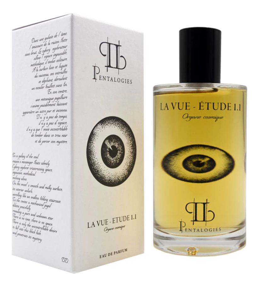 В верхнем аккорде парфюма смолистые ноты кипариса и тонкий запах ягод можжевельника сочетаются с ванильно-смолистыми оттенками элеми и пряными нюансами кардамона и мускатного ореха. В сердечном аккорде медовый аромат розы соединяется с призрачной пряностью семян моркови и пудровыми тонами ириса. Тогда как финальный аккорд дарит древесный запах кедра и сандала, цветочные оттенки фиалки и гелиотропа, мягкие нюансы костуса и нежнейший белый мускус. Мерцающие альдегиды окутывают композицию Pentalogies Etude 1.1: La Vue, делая ее звучание почти мистическим.