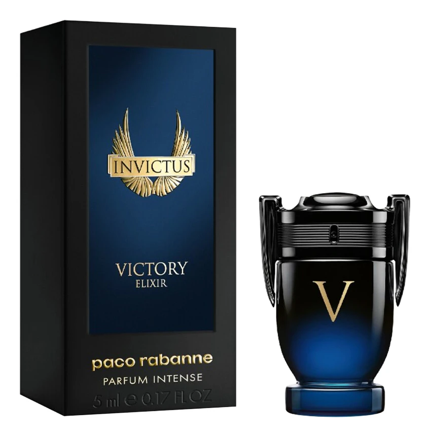 Парфюм Rabanne Invictus Victory Elixir представлен в градиентно окрашенном черно-синем флаконе в форме кубка с символизирующей победу золотистой буквой «V» в центре.