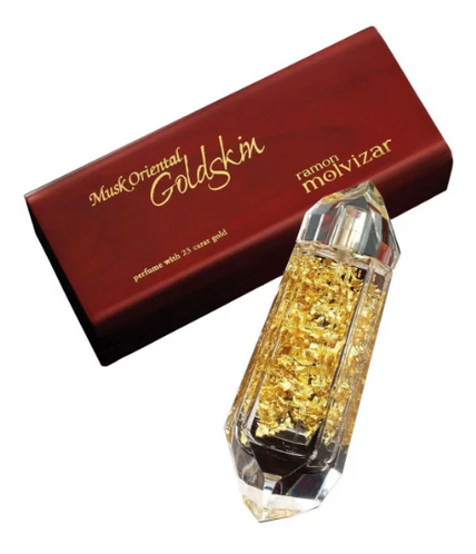 Волшебный Рамон Молвизар Восточный Мускус Голдскин напоминает менее насыщенные изысканные духи Ramon Molvizar Goldskin. Внутрь флакона Oriental Goldskin Musk помещены золотые хлопья, остающиеся на вашей коже мерцающей драгоценной пыльцой.
