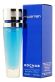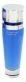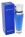 Удлиненная форма флакона выполнена в ярком синем цвете и увенчана серебристым колпачком.