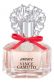 Элегантный флакон имеет шестиугольную форму, увенчан серебристой декорированной крышечкой, на горлышке повязан розовый бантик.