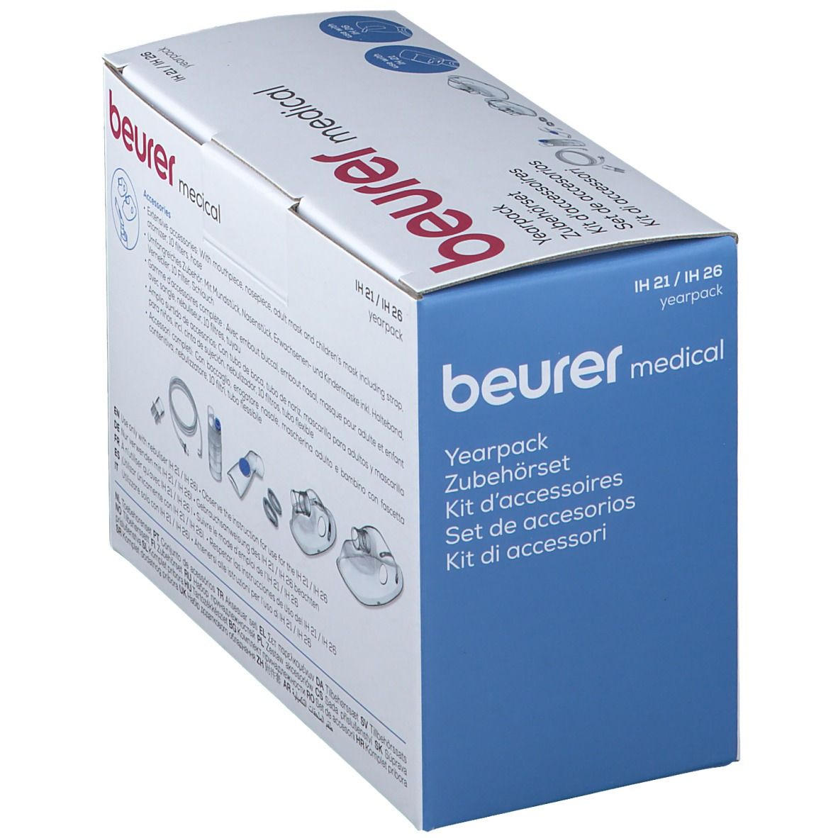Комплект аксессуаров Beurer Yearpack для ингаляционных приборов IH 21, IH 25, IH 26. Включает мундштук, насадку для носа, маску для взрослых, детскую маску, небулайзер, 10 фильтров и шланг для проведения ингаляционных процедур.