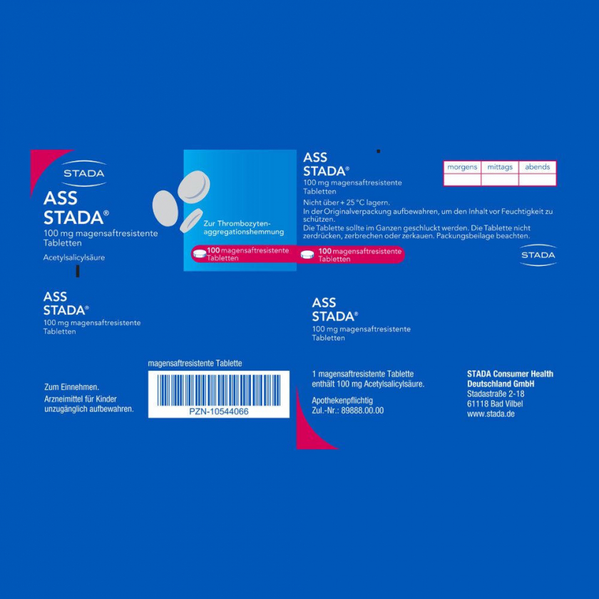 ASS STADA® 100 мг - желудочно-резистентные таблетки с ацетилсалициловой кислотой для профилактики инфаркта миокарда, инсульта и сердечно-сосудистых проблем у пациентов с предрасположенностью. Препарат предотвращает образование тромбов и защищает от сосудистых окклюзий. Имеет щадящую для желудка формулу.