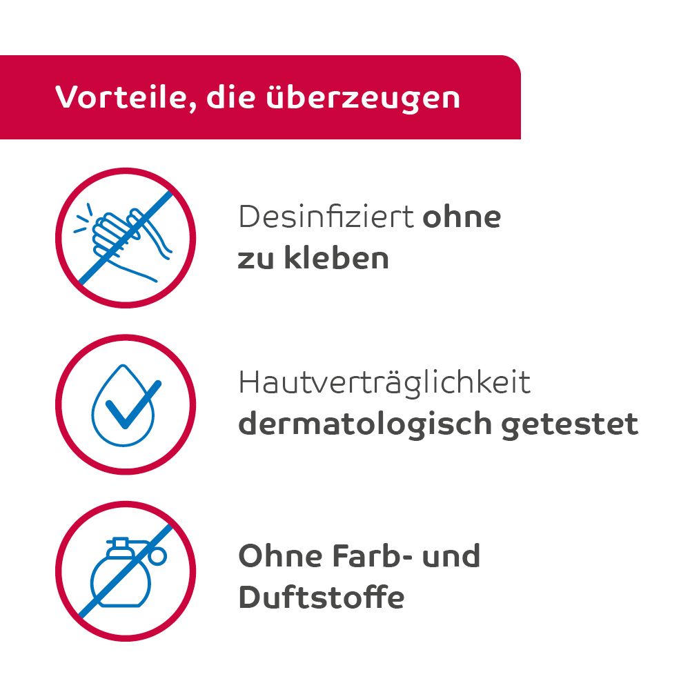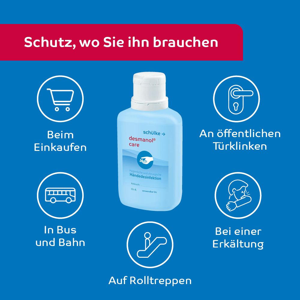 Алкогольная дезинфекция для рук desmanol® care hyclick с ухаживающей формулой для гигиенической и хирургической дезинфекции. Эффективна против бактерий, микобактерий, дрожжей и вирусов. Без красителей и парфюма, с особо бережным уходом за кожей.
