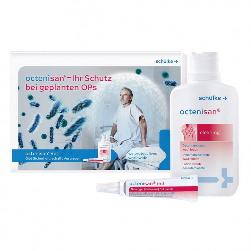 Медицинский набор для предоперационной деконтаминации, включающий лосьон для мытья тела и гель для носа. Содержит антисептик октенидин для снижения риска инфекций. Предназначен для использования за 5 дней до операции для полной гигиенической подготовки пациента.