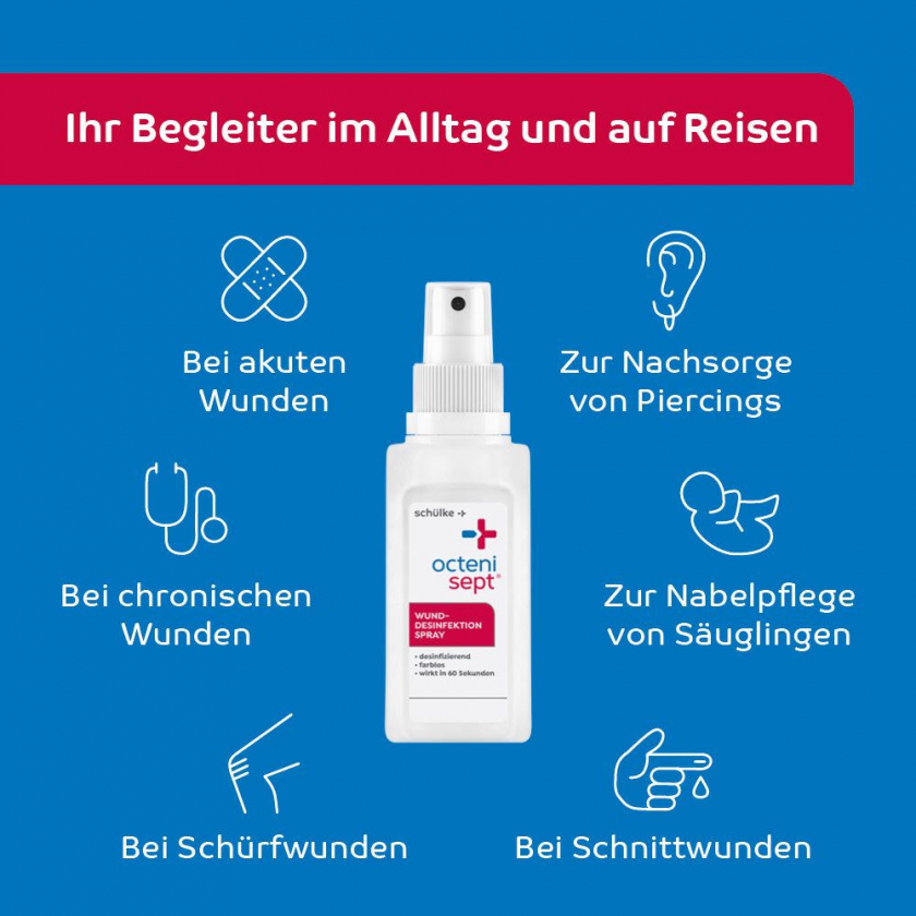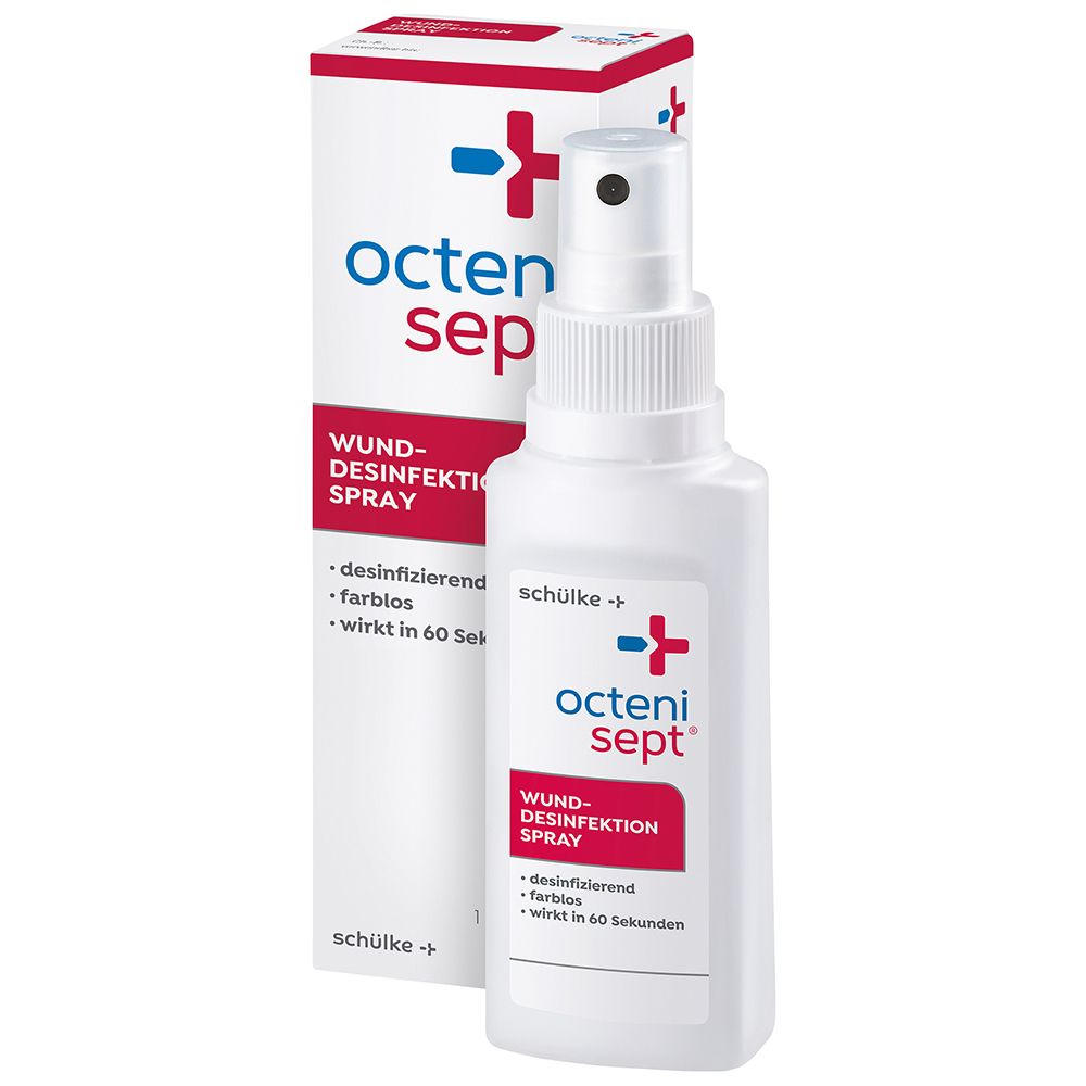 Octenisept® Wund-Desinfektion-Spray - антисептический спрей для дезинфекции ран. Эффективен при обработке ссадин, порезов, хронических ран, а также для антисептической обработки слизистых оболочек перед медицинскими процедурами. Содержит октенидин и феноксиэтанол, обеспечивает быструю и безболезненную дезинфекцию. Подходит для взрослых и детей, включая новорожденных (с осторожностью).