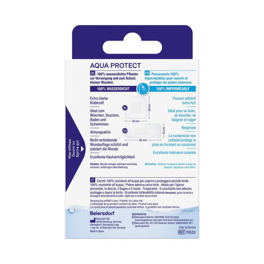Водостойкие пластыри Hansaplast Aqua Protect с усиленной клейкостью для защиты ран во время душа, купания и плавания. Прозрачные, гибкие, латекс-фри, подходят для взрослых и детей, обеспечивают 100% водонепроницаемую защиту при мелких травмах, ссадинах и волдырях.