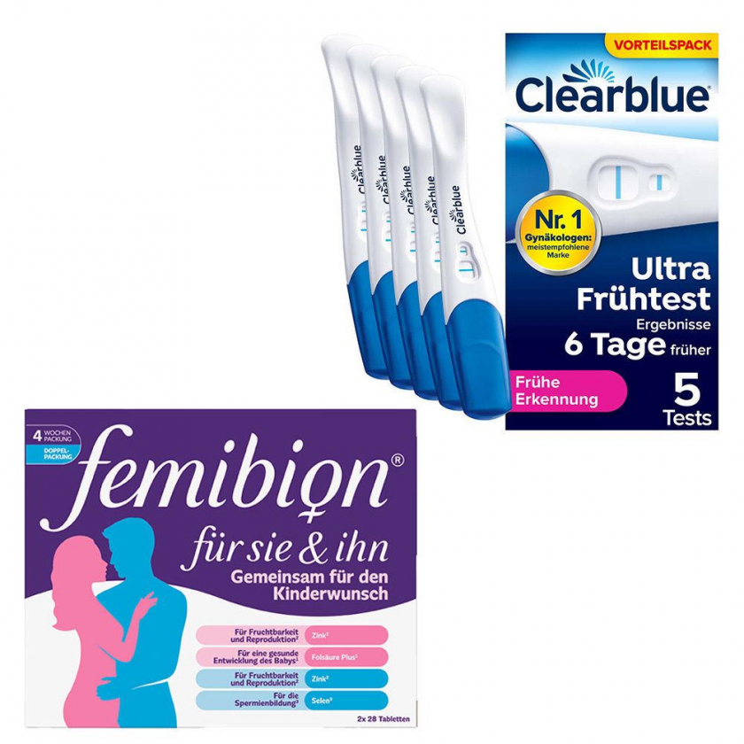 Clearblue Schwangerschaftstest frühe Erkennung 5er + Femibion für Sie & Ihn – Tabletten zur Unterstützung bei Kinderwunsch