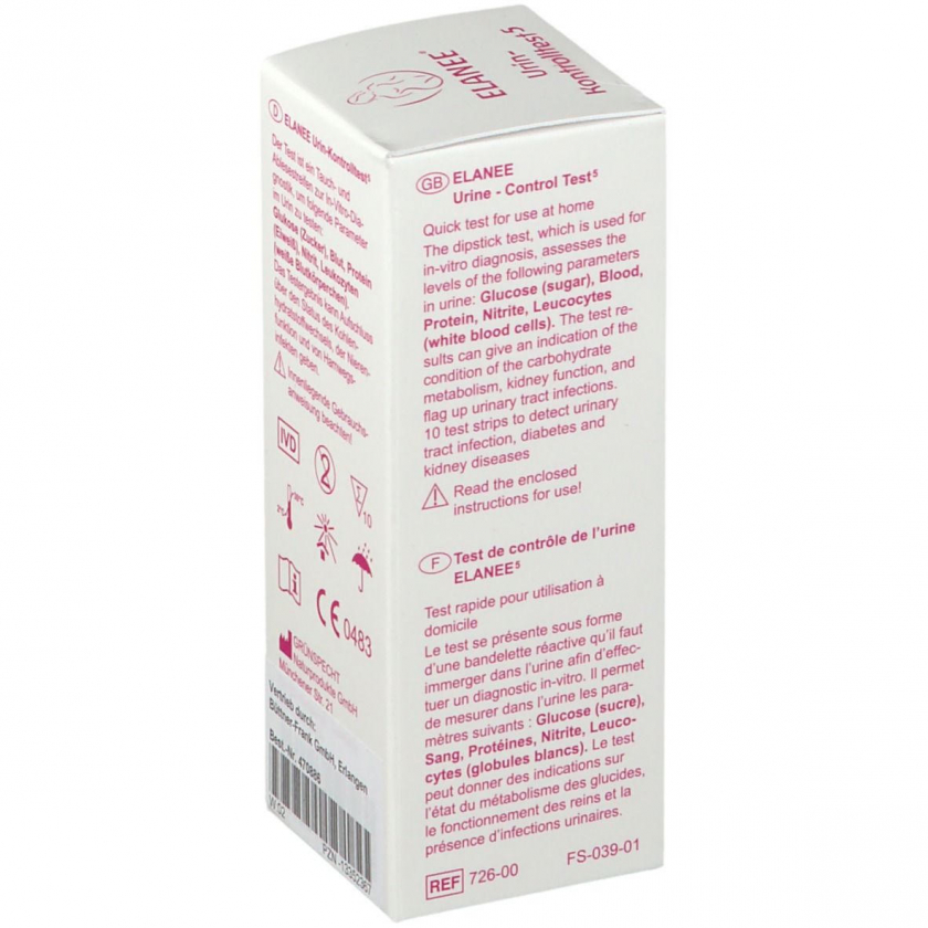 ELANEE Urin-Kontrolltest - диагностическая тест-полоска для домашнего анализа мочи. Позволяет определить наличие глюкозы, крови, белка, нитритов и лейкоцитов в моче, что помогает выявить инфекции мочевыводящих путей, диабет и заболевания почек. Простой в использовании тест для самоконтроля здоровья.
